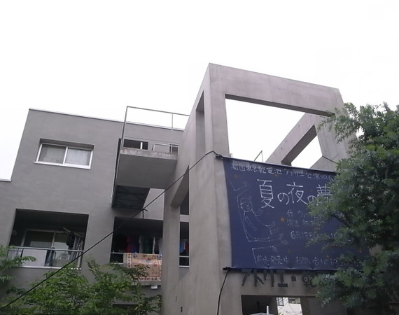 暮し始めてからの正面です。手前には地下に設けた主催する劇団の稽古場・アトリエ乾電池へのアプローチ「未満の塔」、奥には住宅がみえます。(☆)