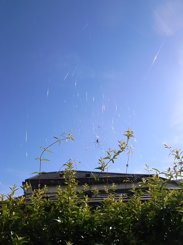 キャロライナジャスミンの葉やつる首と家の本体を使って、ダイナミックな蜘蛛の巣が張られている。